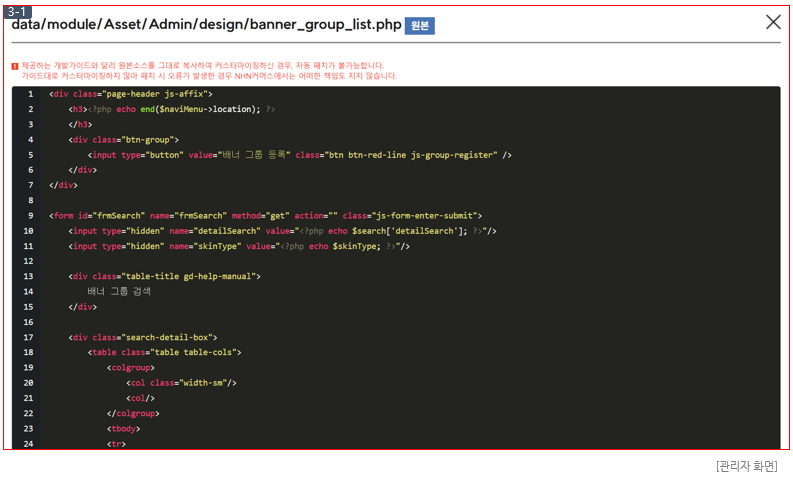 - 원본 관리자 스킨소스를 운영소스로 복사 시, 복사된 버전이 관리자스킨에 즉시 적용되어 개발중 또는 개발완료된 기존 파일이 있는 경우 덮어쓰기 되므로 주의 바랍니다.