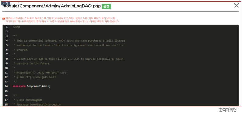 ① 폴더 또는 파일 선택 : 내용을 확인할 파일이 포함된 폴더를 선택하면 폴더 내 포함된 파일이 우측에 노출됩니다. ② 소스보기 : 이미지(2-1)과 같이 선택한 파일의 소스를 확인할 수 있습니다. 상단에 "운영"이라는 표시가 노출되어 원본소스임을 확인할 수 있습니다.